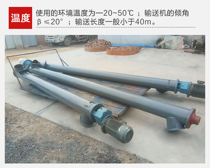 2、螺旋輸送機使用的環境溫度為—20~50℃ ;輸送機的傾角β≤20°;輸送長度一般小于40m,最長不超過70m。