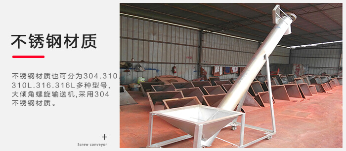 不銹鋼材質(zhì)也可分為304.310.310L.316.316L多種型號,大傾角螺旋輸送機,所有的機型都可以采用304不銹鋼材質(zhì),但是當(dāng)輸送距離長時,表面積增大,打磨難度增加,一般會選擇噴砂,從視覺上就不會像常見的不銹鋼那樣光亮,但質(zhì)量不會有影響。