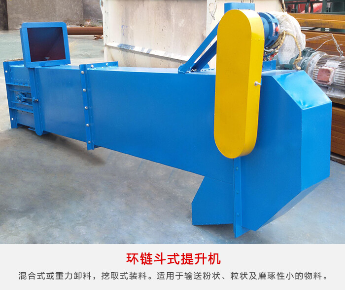 環鏈斗式提升機采用混合式或重力卸料,挖取式裝料。牽引件用優質合金鋼高度圓環鏈,適用于輸送粉狀、粒狀及小塊狀的無磨琢及磨琢性小的物料,如煤、水泥、碎石、砂子、化肥、糧食等。