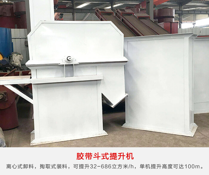 膠帶斗式提升機采用離心式卸料,掏取式裝料,鋼絲繩膠帶強度大,可提升各種粉狀、粒狀和塊狀,可提升32-686m3/h,單機提升高度可達100m,易損件少,維護費用比一般斗式提升機減少80%以上。