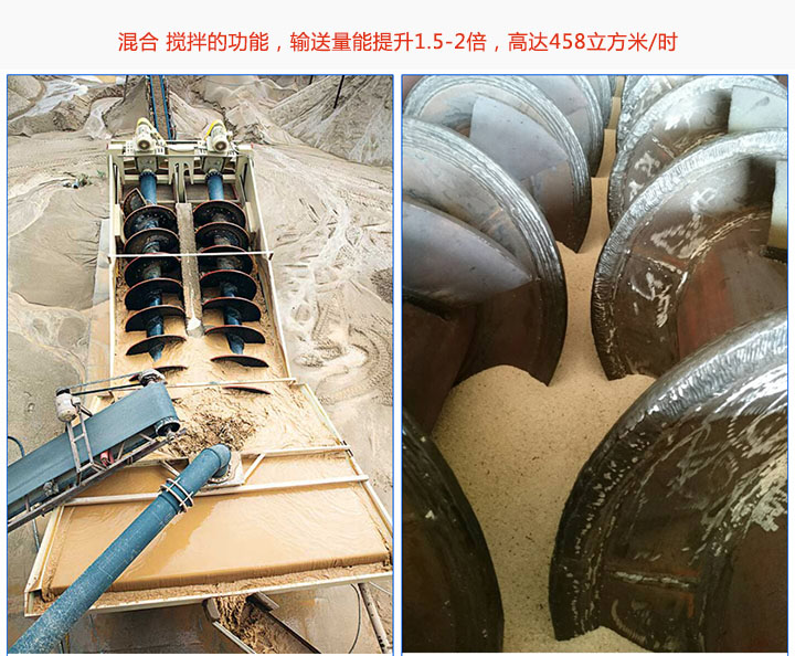 雙軸螺旋輸送機(jī)是兩片螺旋葉片組合而成,兩根螺旋軸相反方向旋轉(zhuǎn),具備混合、攪拌的功能,輸送量能提升1.5-2倍,高達(dá)458立方米/時。
