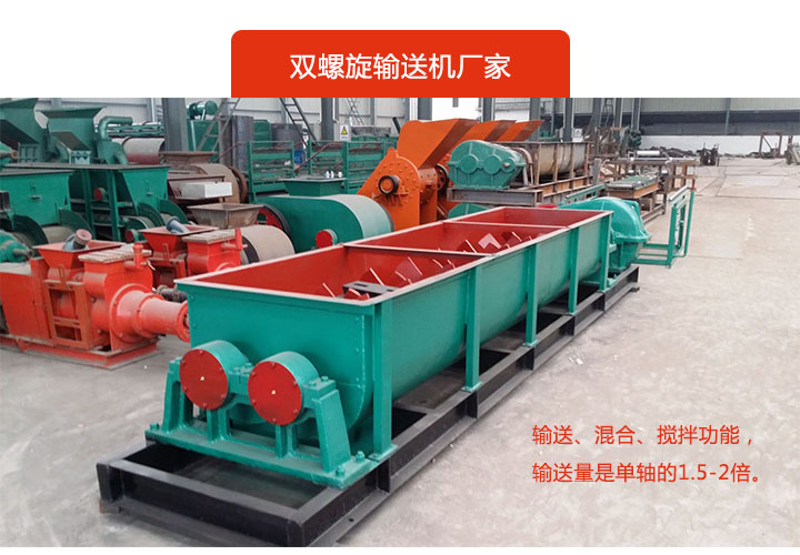 雙軸螺旋輸送機(jī)是利用兩根螺旋軸(一正一反)輸送物料,同時具備輸送、混合、攪拌功能,不易堵料;輸送量是單軸的1.5-2倍。