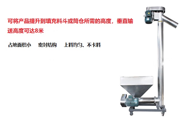 物料隨螺旋高速旋轉,被輸送的物料從水平部分的進料口加入,通過旋轉的水平進料螺桿送入輸送機和垂直部分,然后將物料向上推至出料口出料口由垂直螺桿,物料隨螺桿高速旋轉,被輸送的物料從水平部分的進料口加入,通過旋轉的水平進料螺桿進入輸送機,然后用垂直螺旋將物料推到出料口排出。