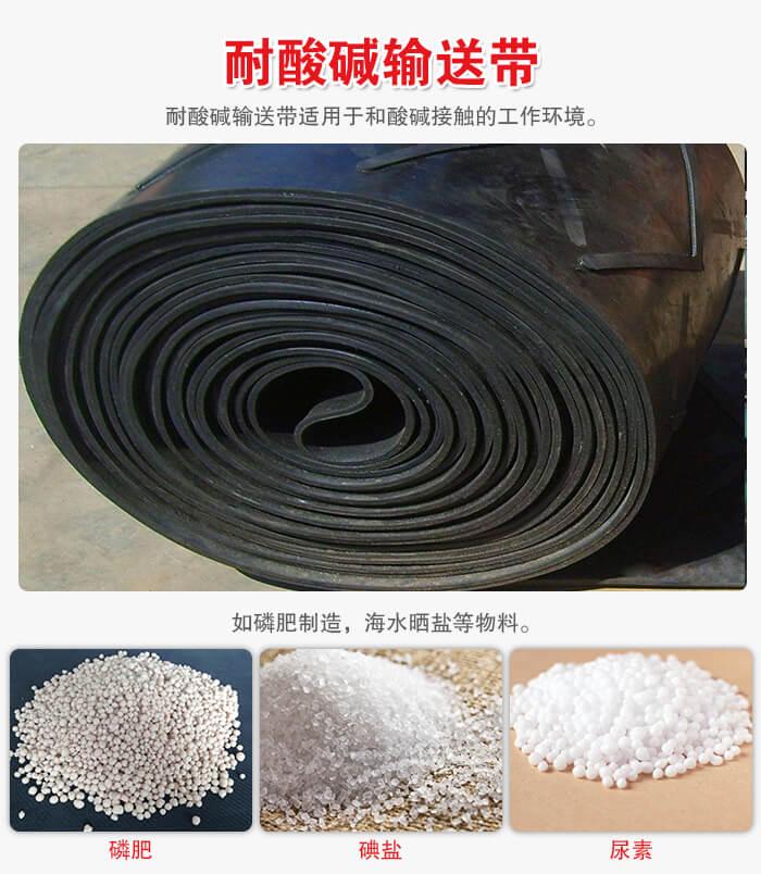 耐酸堿輸送帶適用于和酸堿接觸的工作環(huán)境,如磷肥制造,海水曬鹽,覆蓋膠采用橡塑共混并填充算堿性優(yōu)異的性情材料, 比氯丁橡膠耐酸堿輸送帶耐酸堿性能更優(yōu)。